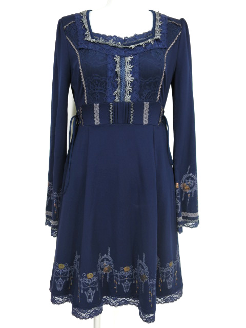 ■王冠&薔薇プリントワンピース 紺 ゴシックなバラや王冠のプリントの入ったデザインのワンピースです。 |