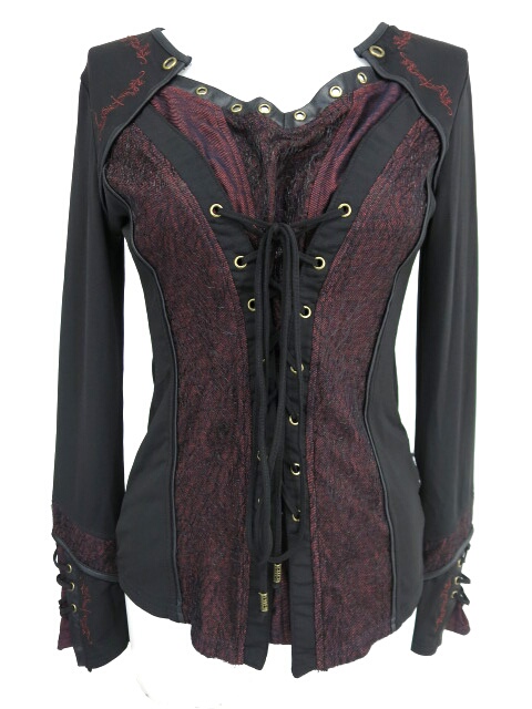■編み上げ付き長袖カットソー 黒×エンジ ネットのような柄のレースを重ねた生地の切替デザインとなっております。 |