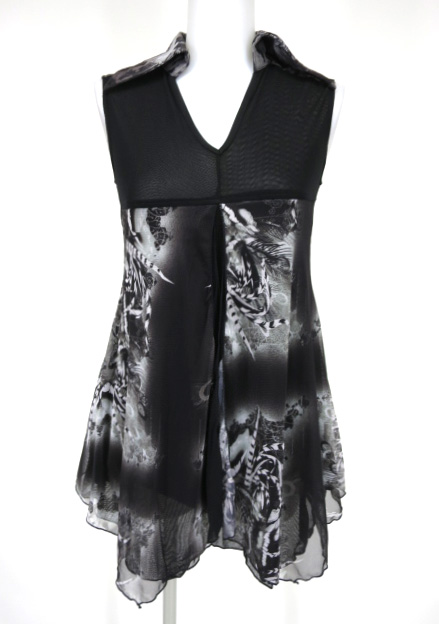 ■羽根柄衿付きノースリーブワンピース 黒 和風な羽根柄のメッシュチュールを重ねたチュニックワンピースです。 |