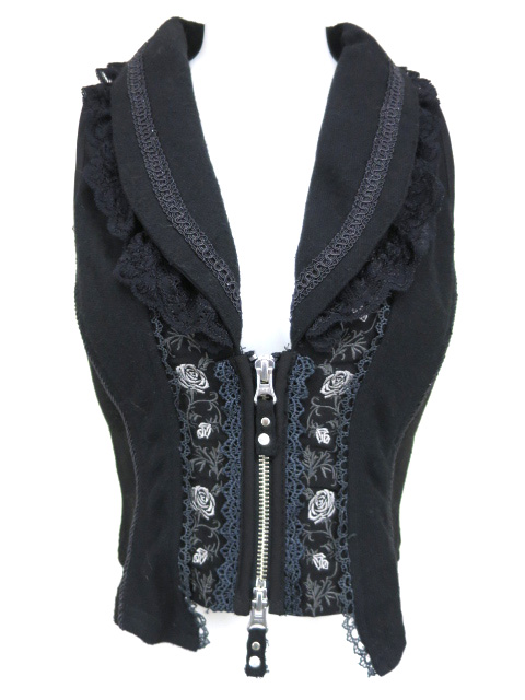■薔薇刺繍入りジップアップベスト 黒 やや細かな毛羽立ちが見られ使用感ございます。 |