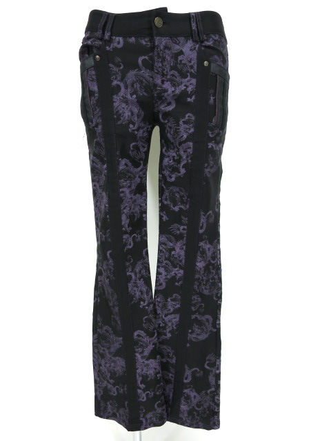 ■龍柄ブーツカットパンツ 黒×紫 龍のプリントが入ったブーツカットパンツです。ストレッチが効いているため伸縮性がございます。 |