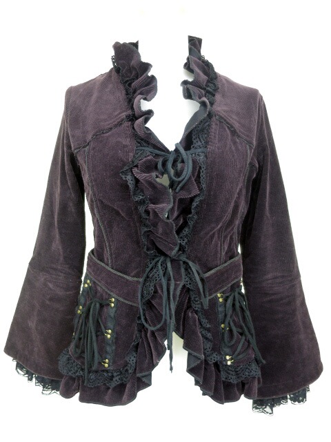 ■コーデュロイフリルボレロジャケット パープル コーデュロイ生地のジャケットです。正面はひもで2箇所結んで閉じるデザインになっています。 |