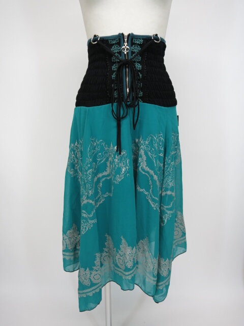 ■シフォン重ね2wayスカート 黒×エメラルド スカートとベアトップチュニックとしてご利用いただける2way仕様の一着。プリントの入ったシフォンの切替デザインです。 |