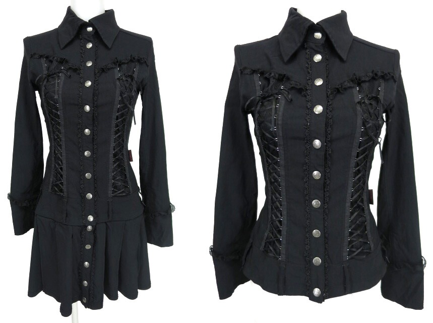 ■シャツ型2wayワンピース 黒 ウェスト部分のボタンを取り外すとシャツとしても使用できます。前後ともにレースアップになっている2wayワンピースです。 |
