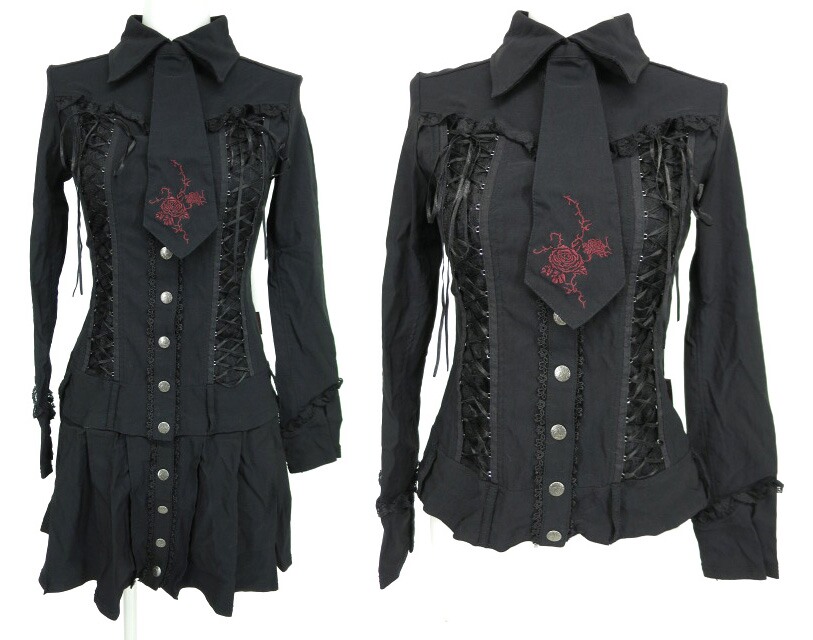 ■タイ付きシャツワンピース 黒×ボルドー 薔薇の刺繍が入ったタイ付きのワンピースです。トップとスカートがボタンで留めてあり、取り外してシャツとしてもお使いいただけます。 |