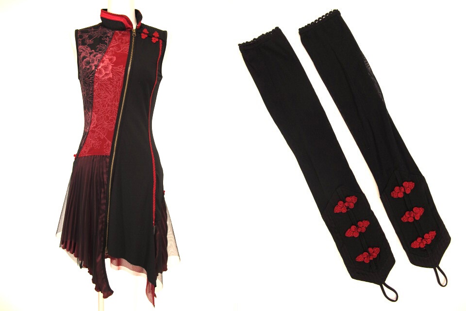 ■チャイナボタン付きノースリーブプリーツワンピース 黒・赤 アシンメトリーデザインのジップアップノースリーブワンピースです。 |