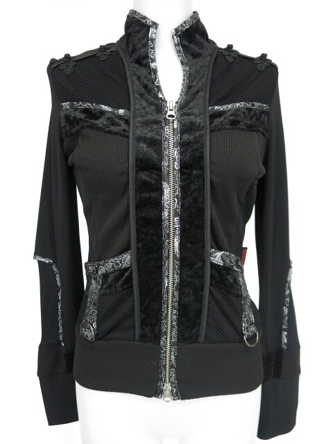 ■チャイナ柄切替ジップカーディガン 黒 袖のフロントの一部にメッシュを使用しております。ストレッチが効いており伸縮性がございます。 |