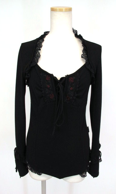 ■バラ刺繍スクエアネック長袖カットソー 黒 レース付きスクエアネック長袖カットソーです。スムースの伸縮性高い素材を使用しています。 |