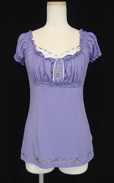■バラ刺繍半袖カットソー ラベンダー 薔薇刺繍を入れた半袖カットソーです。胸元に立体感のあるつくりになっています。伸縮性のある素材を使っています。 |