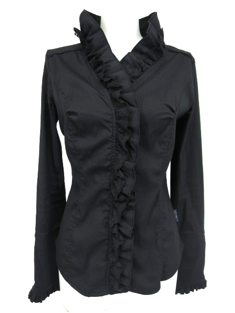 ■フリル付きダブルボタンブラウス 黒 スナップボタン式の長袖フリルブラウスです。ストレッチが効いた素材です。 |