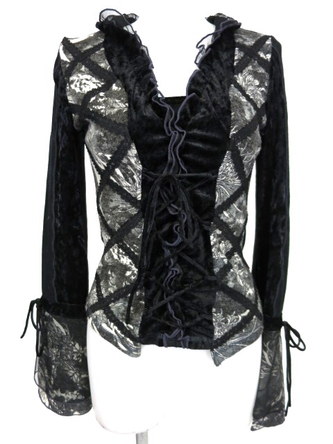 ベロア×和柄切替の長袖ニットカットソーです。フロントは編上げになっており、インナーを重ねた様な胸元になっております。