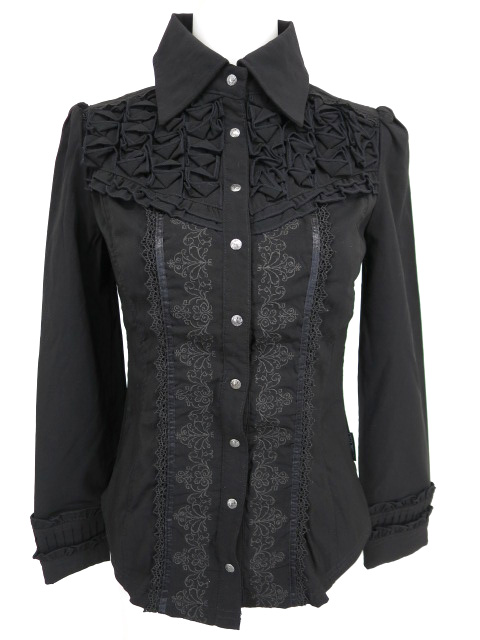 ■刺繍入りフリルブラウス 黒 前・後身頃に刺繍が入った胸元や袖がフリル装飾されたブラウスです7。 |