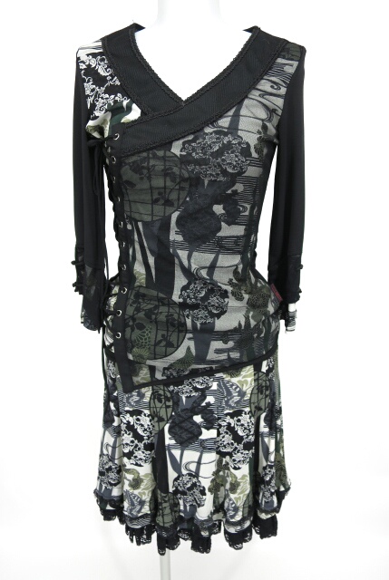 ■和柄チャイナボタン付き2wayスカート・七分袖カットソーアンサンブル 緑 カットソーと2wayスカートのセットです。 |