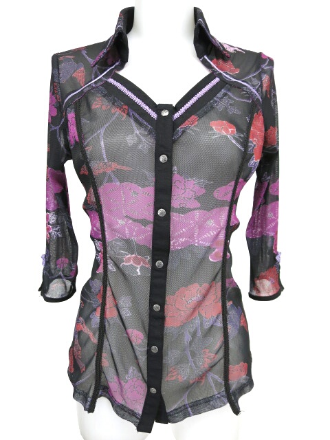 ■和柄メッシュ七分袖ブラウス 黒×紫 和柄のメッシュ生地を使用した七分袖ブラウスです。ストレッチが効いているため伸縮性がございます。 |