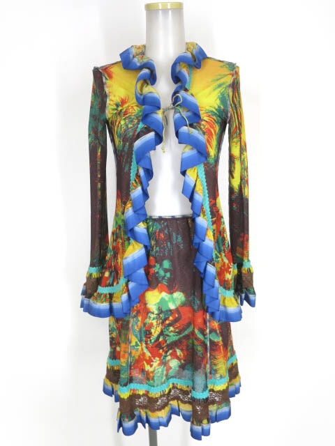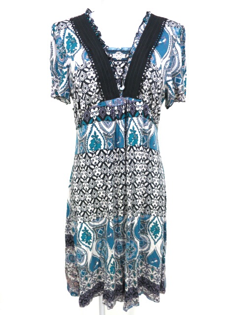 ■総柄チュニックワンピース アイボリー×紫×黒×青 やや生地の毛羽立ちが見られ使用感ございます。 |