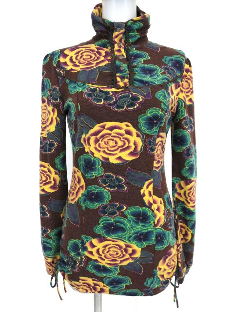 ■花柄ニットプルオーバー 茶 花柄ニットのプルオーバーです。裾の両サイドに紐が入っており、絞ってアレンジ可能です。 |