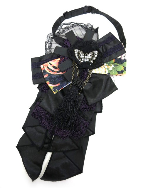 ■蝶ブローチ付き和柄ジャボタイ 黒×ボルドー お取外し可能な蝶のブローチが付いた和テイストなジャボタイです。 |