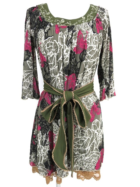 ■蝶&花柄メッシュチュニック カーキ 蝶と薔薇柄が印象的なワンピースです。 |