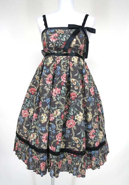 ■French Dress ブラウンローズ ハイウエストなデザインなので全体がスッキリと見えます。胸元のリボン&レースやバックの大きなリボン等どこから見ても抜け目のないコーディネイトに仕上げてくれます。タックで取られたスカート部分のフレアも上品な印象。macherieブラウスとの相性も抜群! |