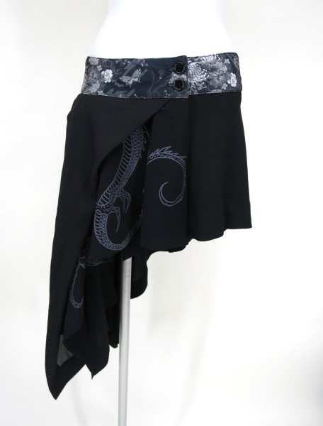 ■アシンメトリー巻きスカート 黒 龍プリントの入ったアシンメトリーデザインの巻きスカートです。ウエストボタンは2段階でサイズ調節できます。 |