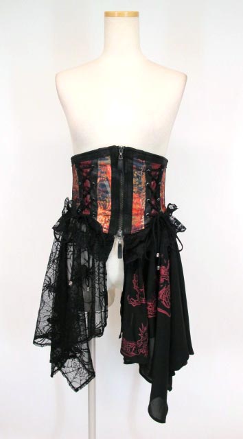 ■コルセットオーバースカート 黒 コルセット付きのオーバースカートです。裾部分は蜘蛛の巣レースと龍プリントを使ったお品です。コルセットボーン入りです。 |