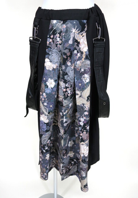■サスペンダー付き和柄切替ロングスカート 黒 前後に深いスリットの入った和柄切替のロングスカートです。 |