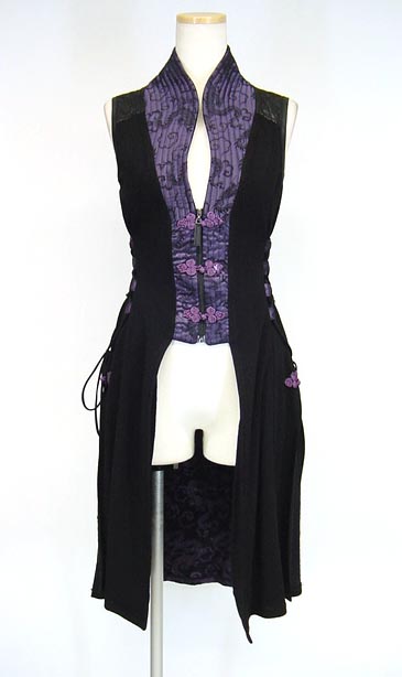 ■チャイナノースリーブワンピースベスト 黒×紫 編み上げなどを使ったチャイナ生地使いのノースリーブワンピースベストです。伸縮性のある素材を使用しています。 |