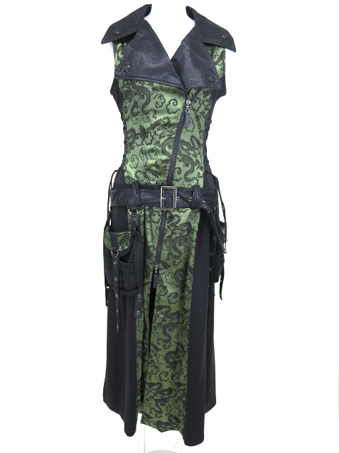 ■ドラゴンサテン切替ノースリーブロングワンピース 黒×緑 ドラゴンサテン切替のライダース風デザインのジップアップノースリーブワンピースです。ウエストにポーチ付きベルトが付属します。 |