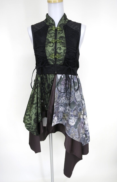 ■フラップ付きチャイナベスト 黒×カーキ 裾に大きなフラップの付いたジップアップベストです。 |