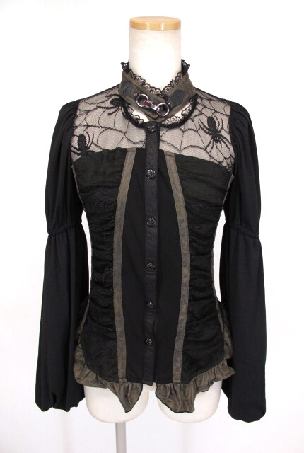 ■メッシュ切り替え立体袖ブラウス 黒×カーキ メッシュレースとの切り替えスタイルの立体袖ブラウスです。 |