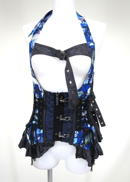 ■和柄コルセットベスト 黒×青 ホルターネックタイプのボーン入りコルセットです。 |