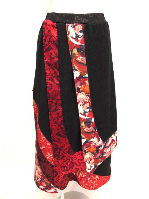 ■和柄ロングスカート 黒×赤 ゴージャスな和柄切り替えデザインのロングスカートです。 |