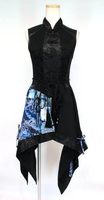 ■和柄切替ジップアップチャイナボタン付きベスト(レッグ付き) 黒×青 下部にかけて鮮やかな和柄生地との切り替えデザインしたジップアップのチャイナボタン付きベストです。 |