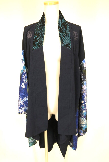 ■着物ロングカーディガン 青 振袖の着物型ロングカーディガンです。正面はボタンなどの留め具の付いていない羽織るだけのデザインです。 |