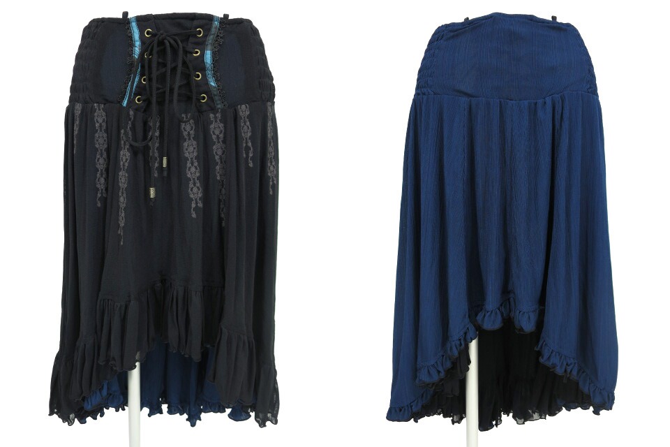 ■蜘蛛の巣レース付き後ろロングパニエスカート カーキ×黒 蜘蛛の巣レースの付いた後ろ下がりのロングスカートです。ウエストはゴム入りです。 |