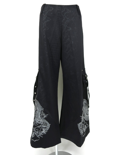 ■龍プリント付きパイソン柄バギーパンツ 黒 裾にラメ入りの龍プリントの入ったバギーパンツです。 |