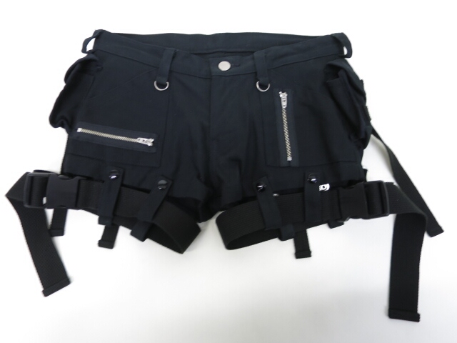 ■ベルト付きミリタリーショートパンツ 黒 セクシーダイナマイトロンドンのStIGMAtAやAddictionのデザイナーを担当されていたKENZO-Aのオリジナルブランドです。ポケットやベルトのたくさんついたミリタリーなデザインのショートパンツです。 |