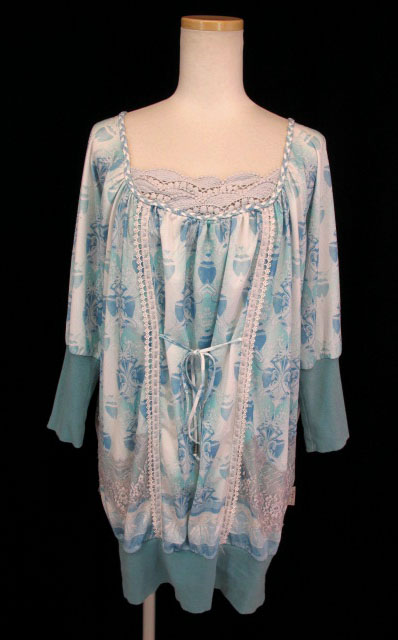 ■ドルマンプルオーバーワンピース 青 ドルマンタイプのプルオーバーワンピースです。総柄プリント生地を使ったレース飾りスタイル。裾などにリブ切替を使っています。 |