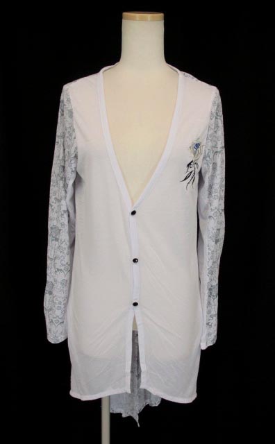 ■薔薇刺繍ロングカーディガン 白×グレー 胸薔薇刺繍のロング丈カーディガンです。背中側プリント入りデザイン。 |