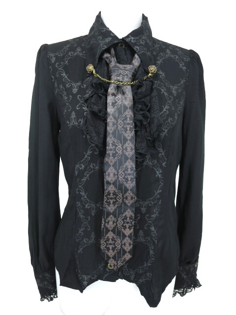■ネクタイ付きブラウス 黒 エイチ・ナオトSTEAM ネクタイ付きブラウスです。胸元のジャボは取り外し可能。グラフィックには百合や歯車のモチーフを使用しています。柔らかく肌触りの良い生地で着心地も抜群です。 |
