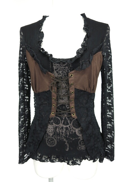■レース切替コルセット長袖カットソー 黒 正面はコルセットのようなレースを重ねたデザインになっています。袖もレースの切替です。 |