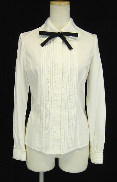 ■トーションレースピンタックブラウス 白 繊細で上品な印象のトーションレースを使用したブラウスです。袖口や襟元にふんだんに施されたトーションレースが可愛らしくもノーブルな雰囲気でお召し頂けます。 |