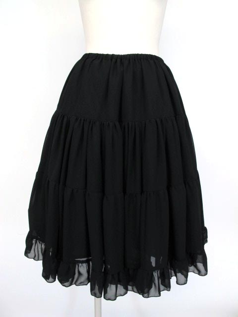■ボリュームシフォンペチコートスカート 黒 ボリュームのあるシフォン生地を使ったペチコートスカートです。ウエスト部分ゴム入りのスカートです。 |