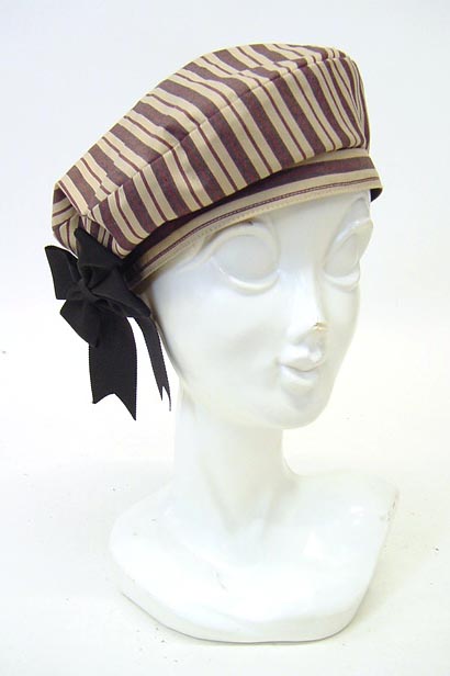 ■レジメンタルストライプ ベレー帽 シナモン×ボルドー レジメンタルストライプ柄のベレー帽です。リボンはブローチタイプになっていて取り外しが可能です。 |