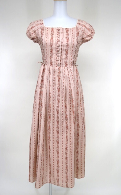 ■ローズストライプ柄ワンピース ピンク サイドに編み上げの付いたエレガントなローズ柄のロングワンピースです。 |